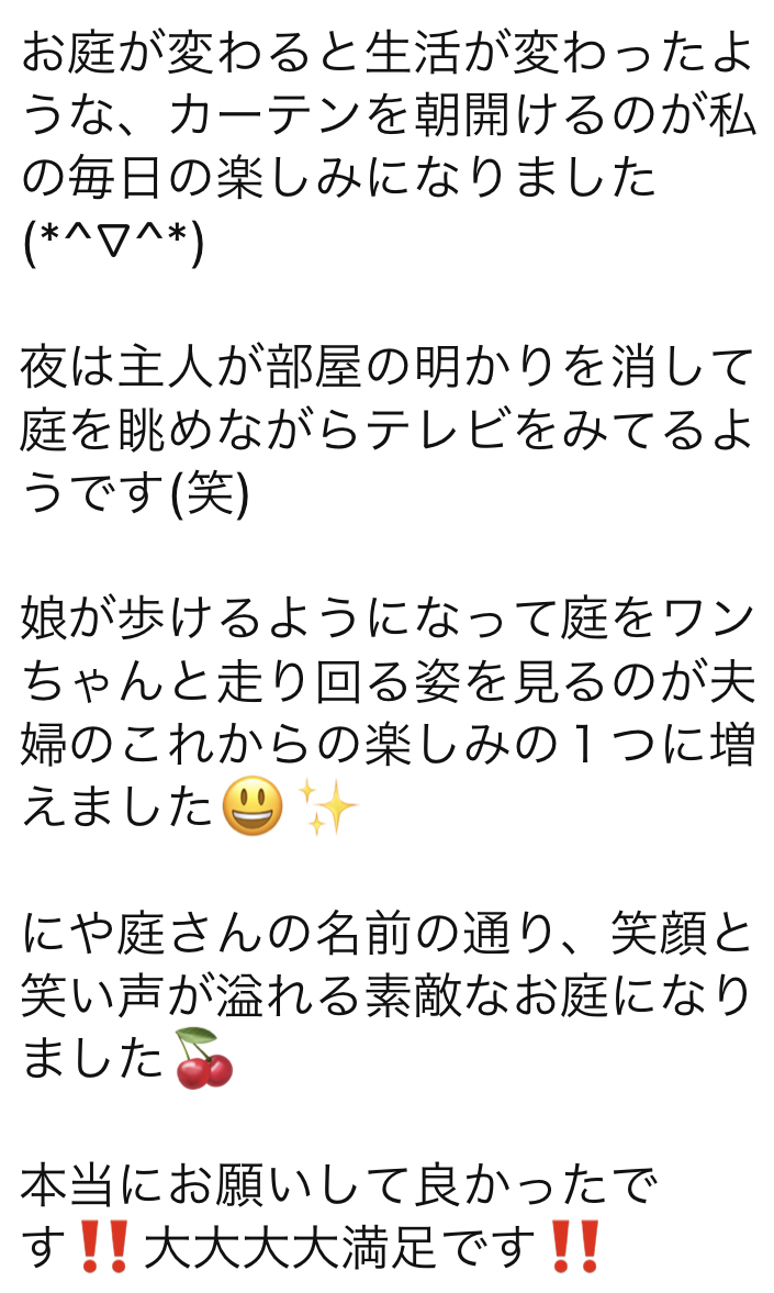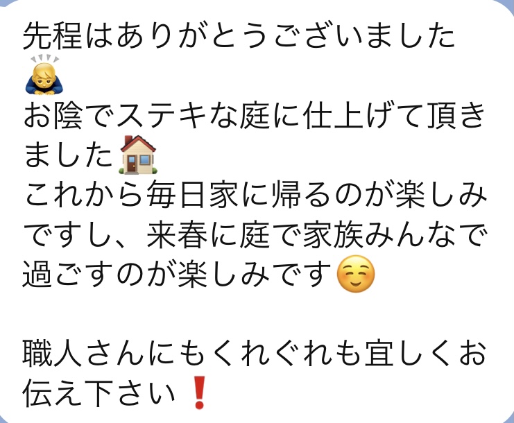 やりがい^^ 未分類 2023年03月29日 【お客様からのお言葉】 ーーーーー ーーーーー ーーーーー ーーーーー ーーーーー とても嬉しいお言葉に元気を頂いております_(._.)_お客様の期待に応えられる様に職人さんには拘ります!本日も一組の職人さんとお別れをいたしました!!ここは絶対にブレません!!! ************************** 「にや庭」は 熊谷市、深谷市、鴻巣市を中心に エクステリア、外構工事のデザインと施工を行っています! ************************** コメントは受け付けていません。 春爛漫 こだわり^^