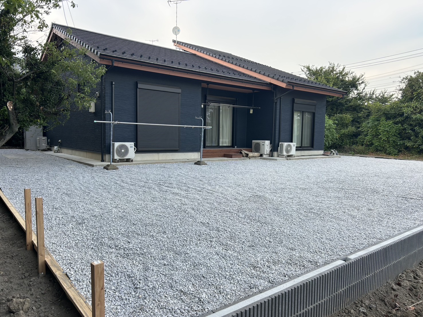 こちらは砕石を敷詰め、転圧して固めます。雑草は生えてしまいますが、除草剤などで対策します。最近は夏が長いので最低シーズン1〜2回の散布が必要です。
