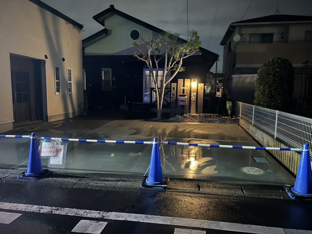 土間打った当日は雨降らなかったので、問題ありません。安心してください、表面は濡れても中は硬化進んでおります。