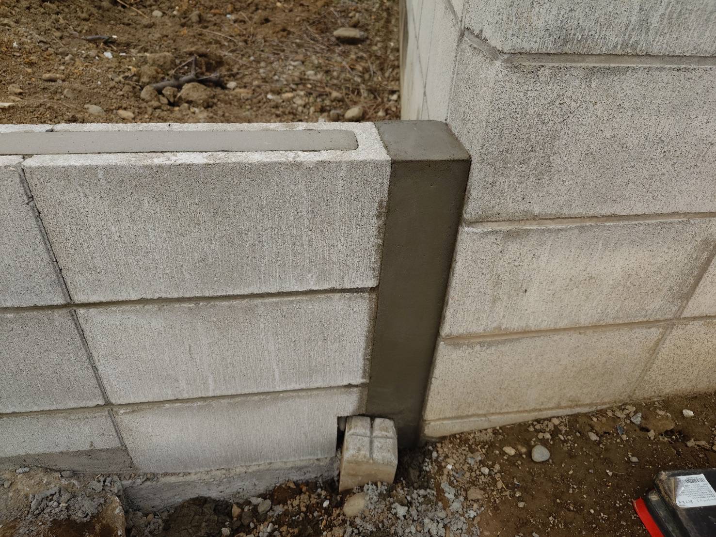 お隣さんとの境界に隙間があります。砂利が流れてしまうので、隙間に仮塞ぎ材作成いたしました
