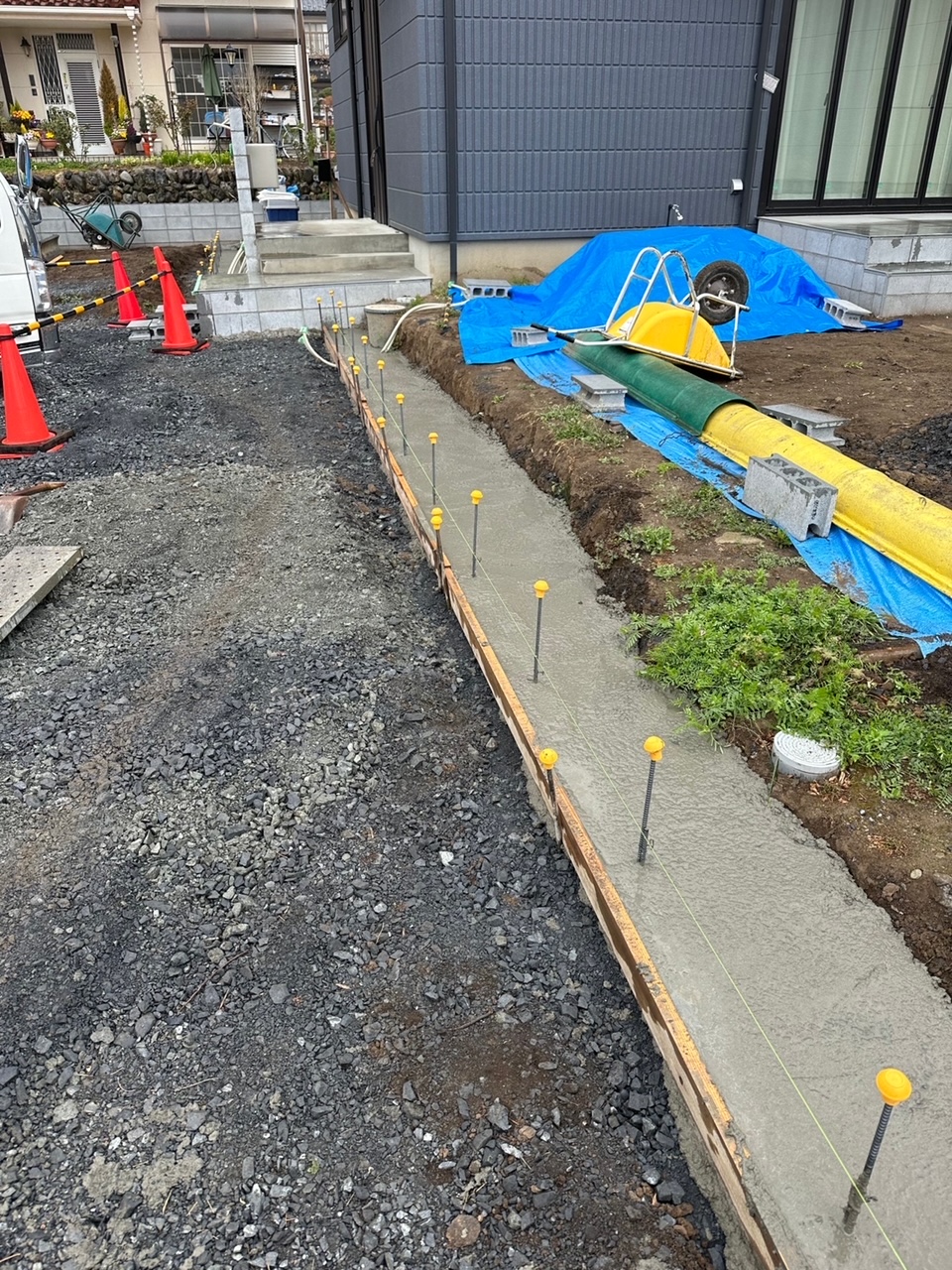化粧ブロックのベースコンクリート打設です。掘削に苦労しました。安全第一の為「鉄筋キャップ」は必ず付けます!付けないと本当に危険です!!