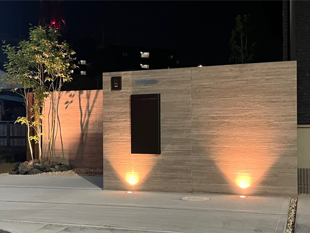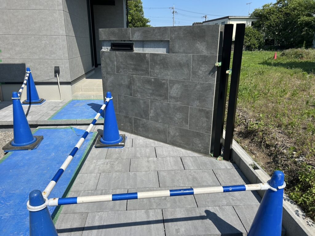 門柱はタカショー・セラレバンテ ブラック タイル アプローチはマチダコーポレーション・アルテア グレー