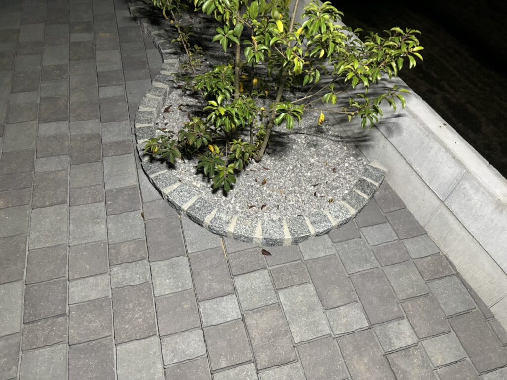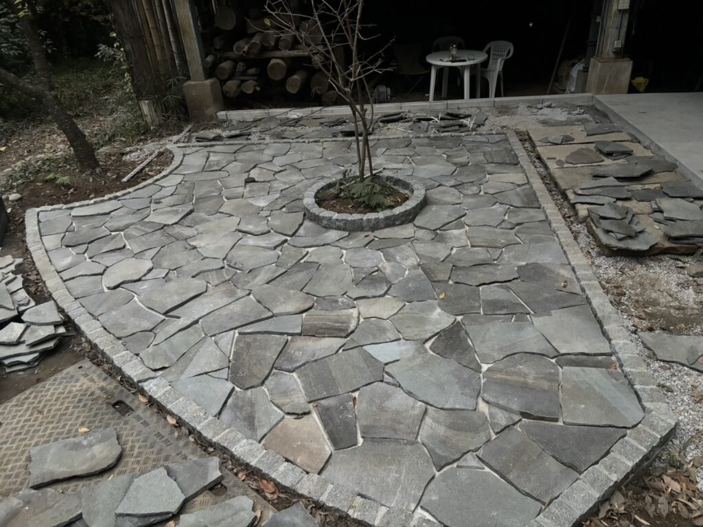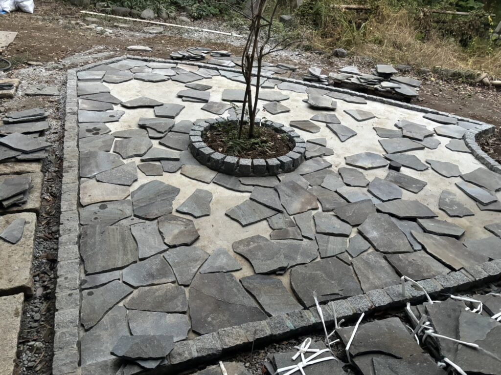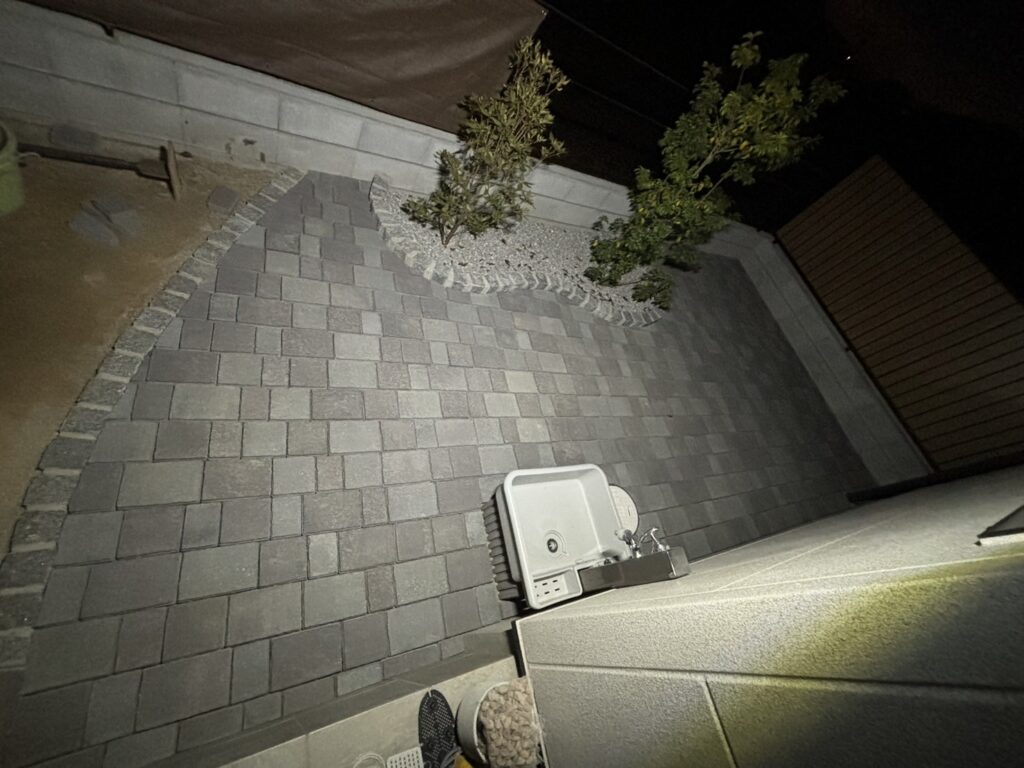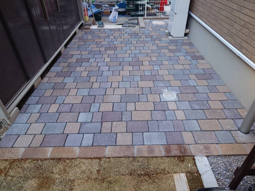 グレー多めのインターロッキング部分は完了です。砂利に比べると落ち葉のお掃除が楽になります😊