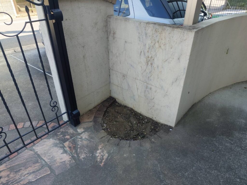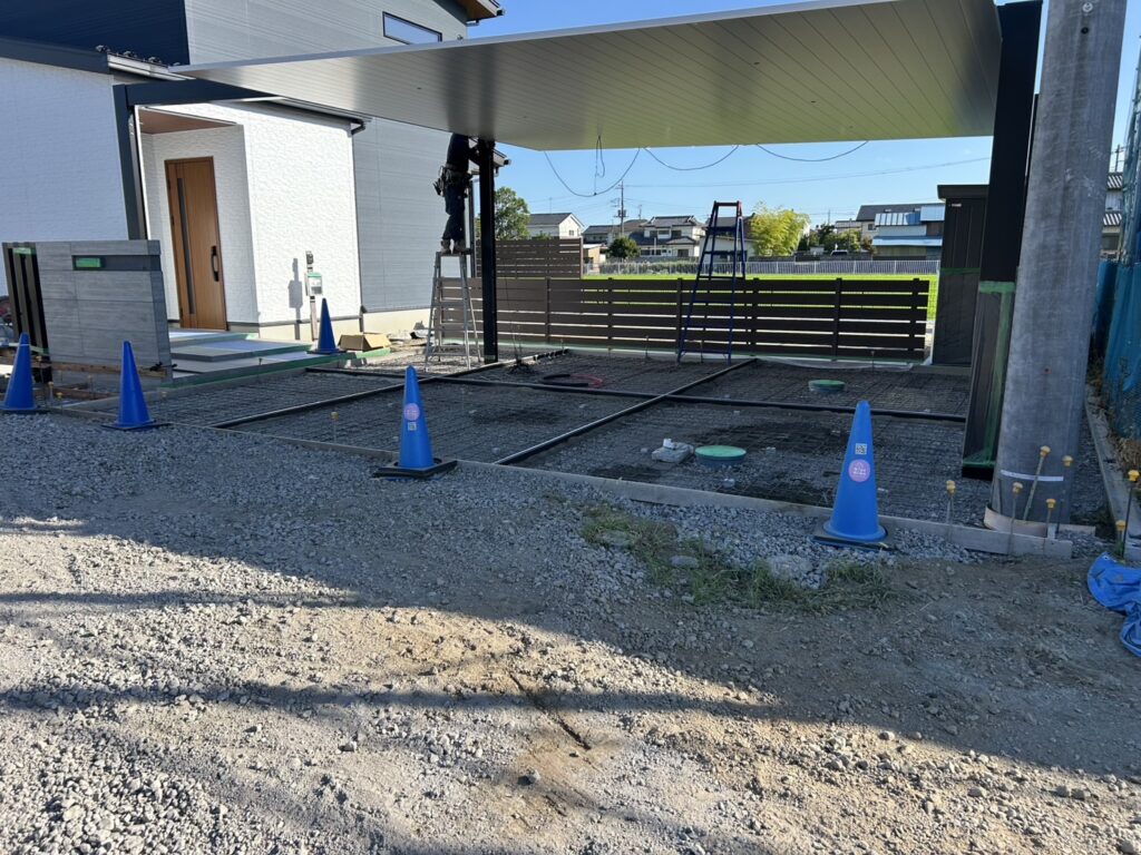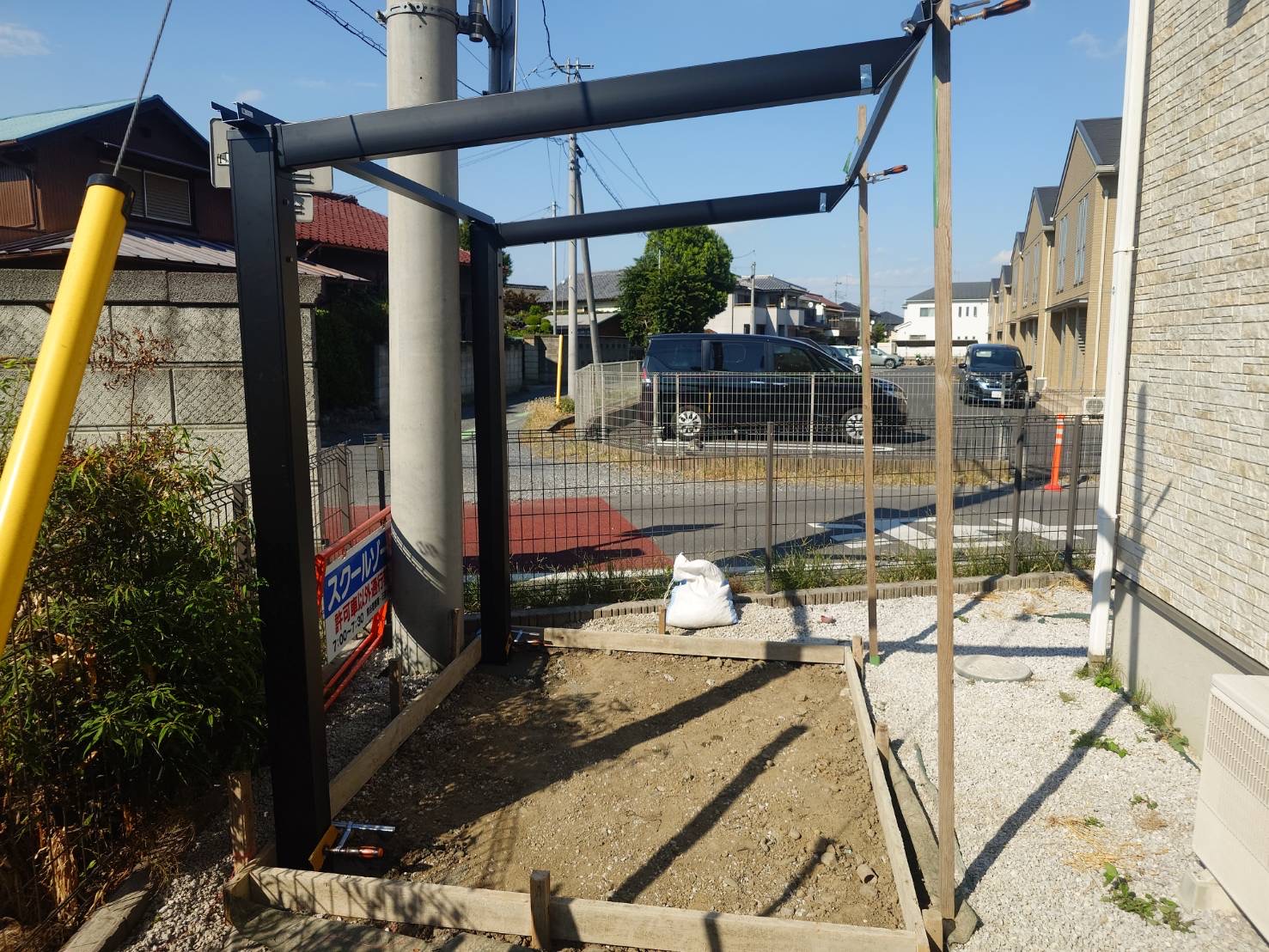裏のサービスヤードにサイクルポート設置します。自転車が倒れないように、🚲キーパーも設置します。土間も打設します。