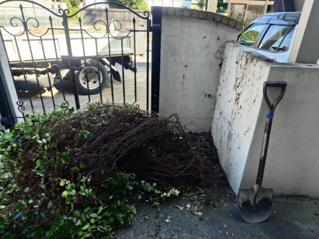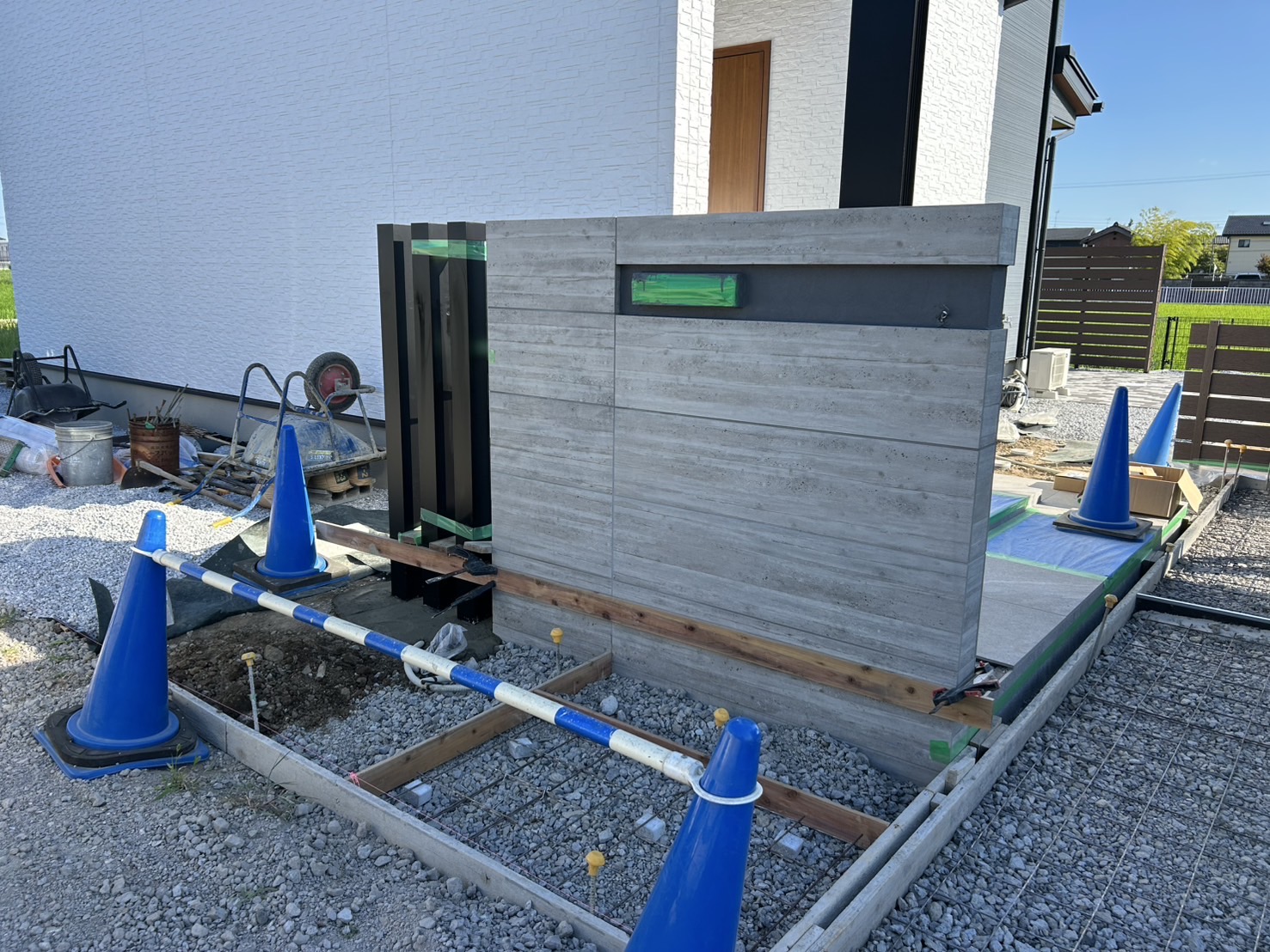 駐車場スペースと門柱前にコンクリート打設します。ただいま打設準備中です。