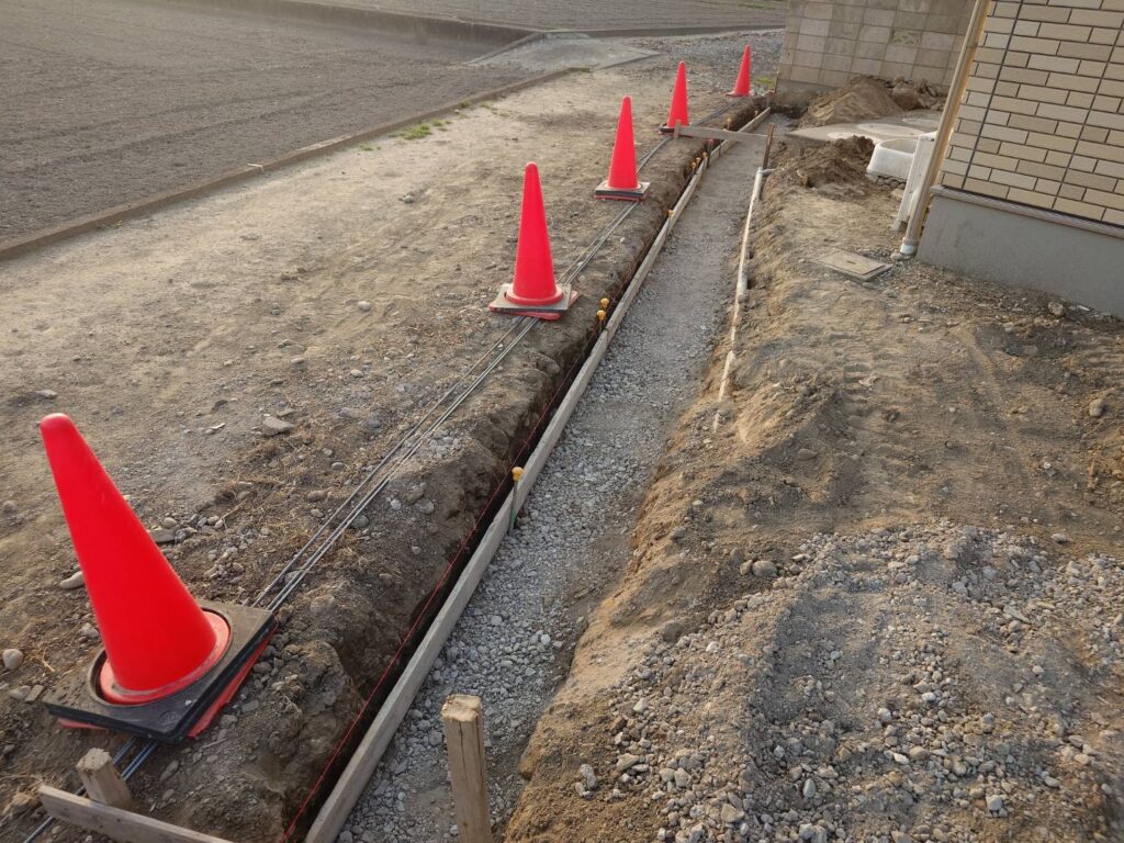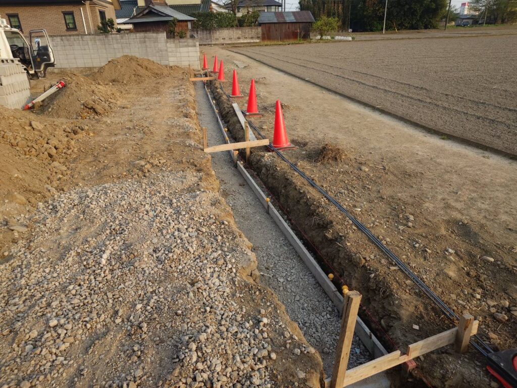 境界ブロックの下地基礎で掘削した土を敷地内に引き直し中です。