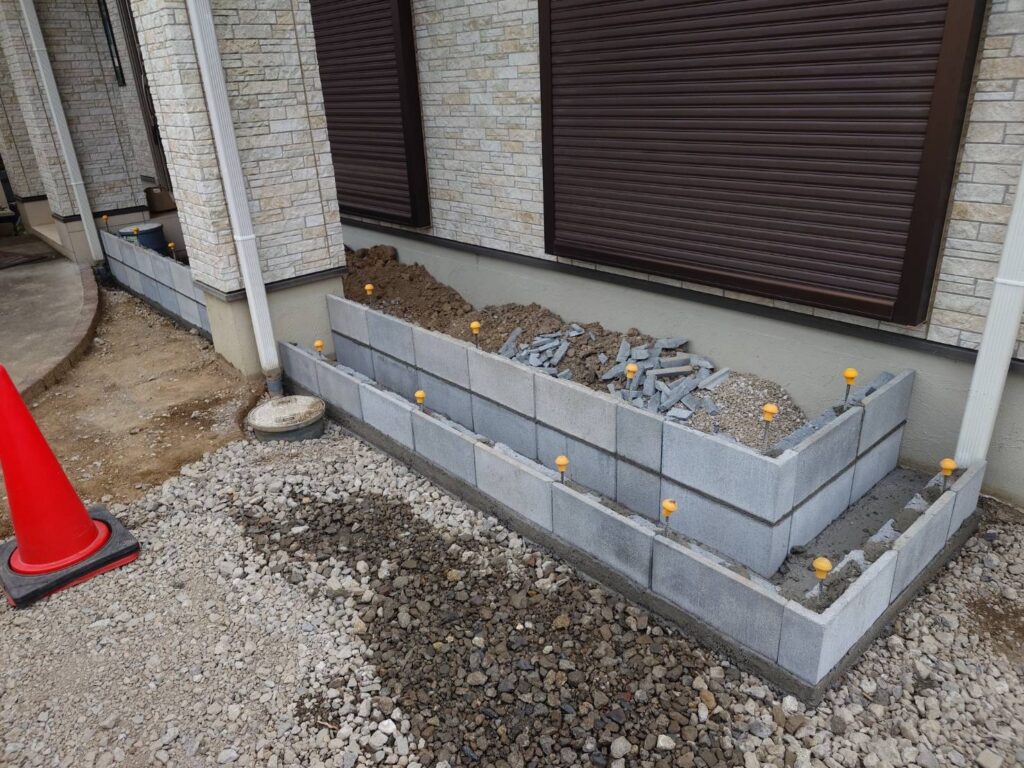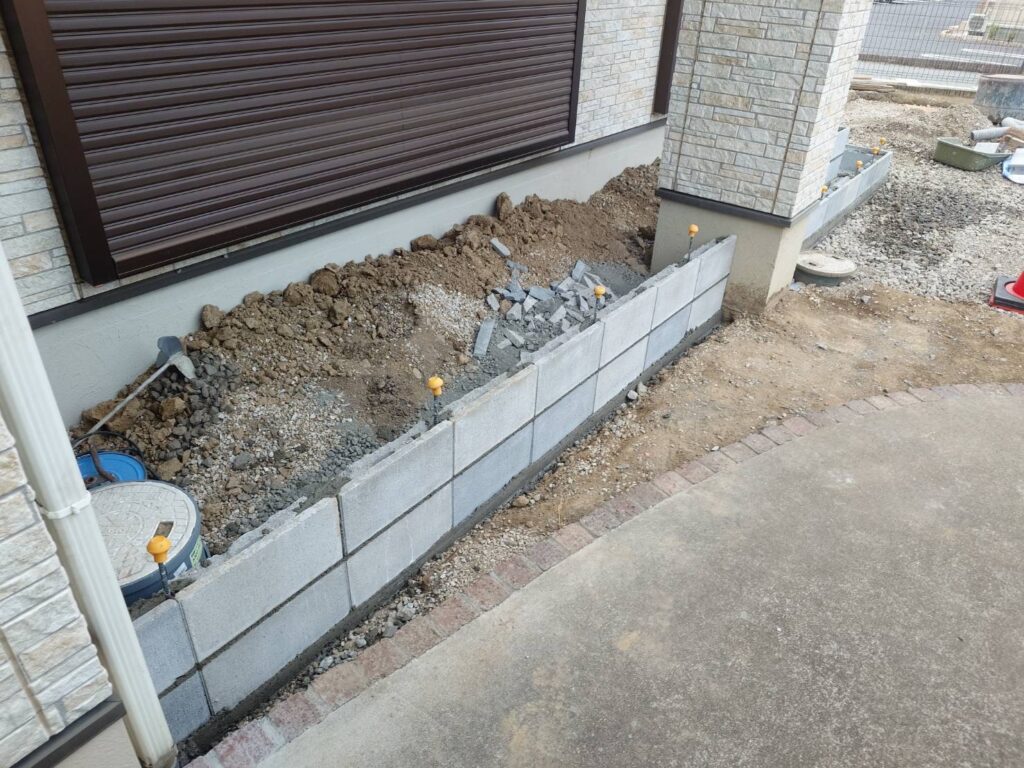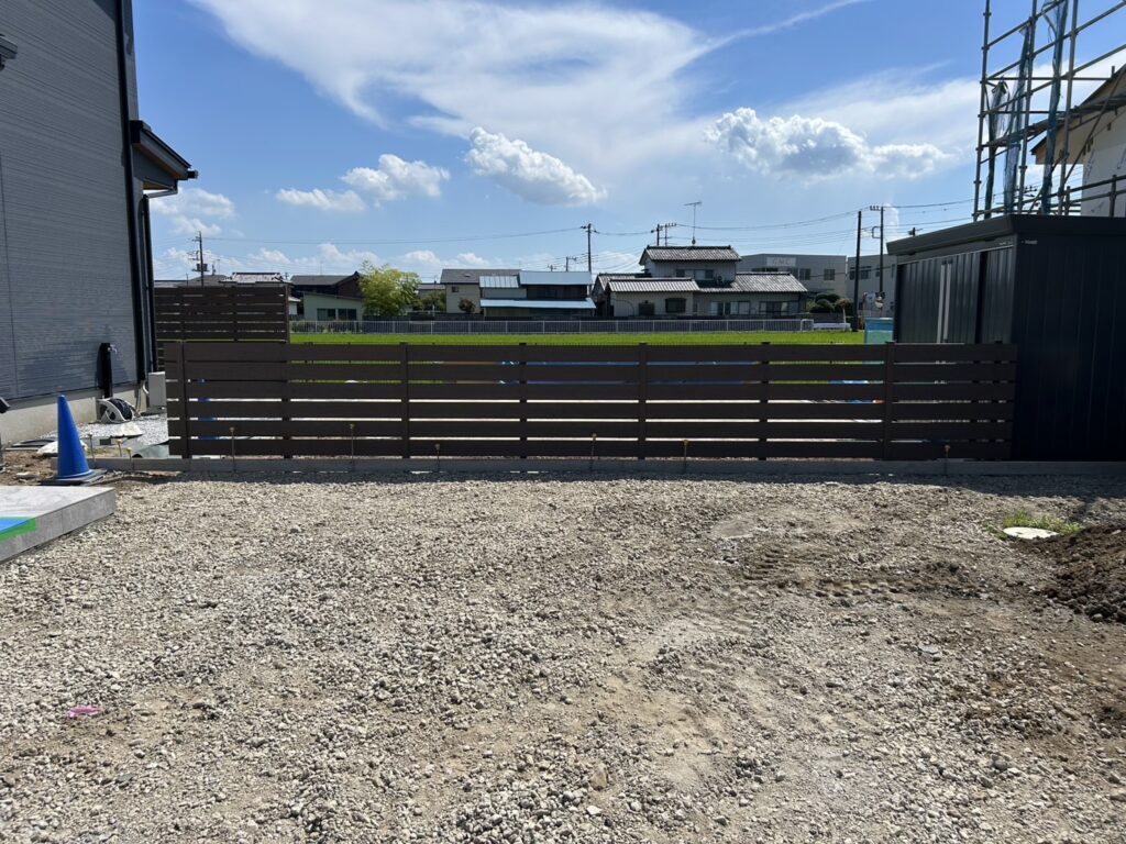 リビング前のタイルデッキ+インターロッキングの前には目隠しフェンス設置です。