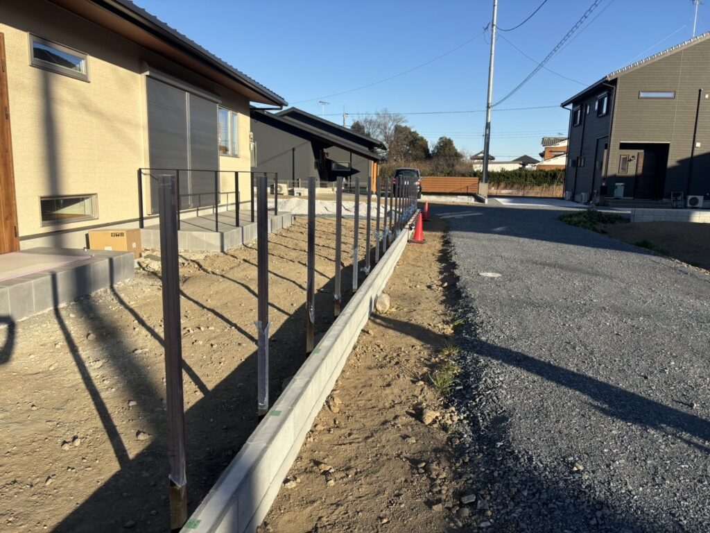 境界ブロック内側に目隠しフェンスの柱を立てます。
