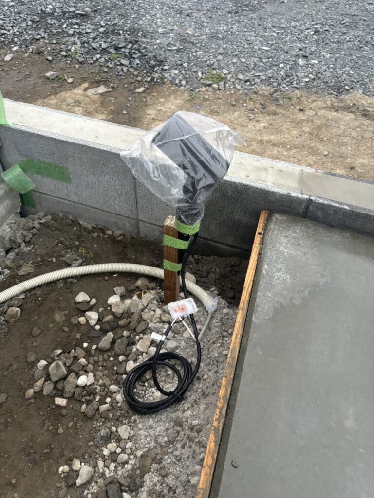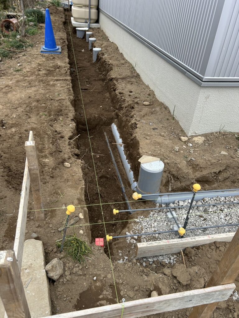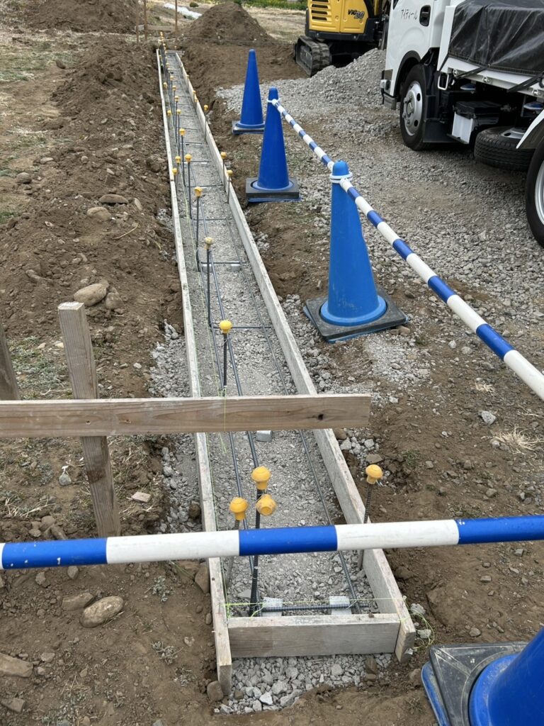 採掘後に砕石敷いてブロックの鉄筋設置。黄色いのはうっかり転んで刺さらないための鉄筋の安全キャップです。