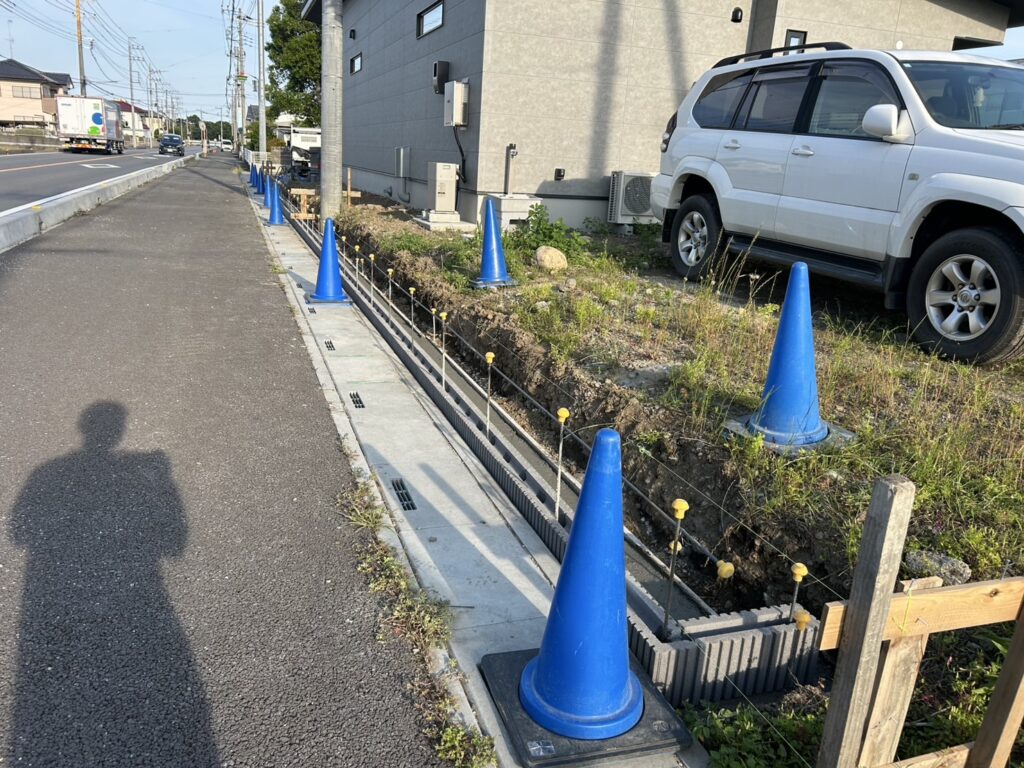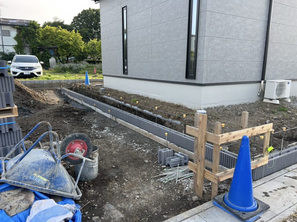 境界ブロック1段目です。鉄筋キャップ安全安心の現場です。いつもありがとうございます🙇‍♀️