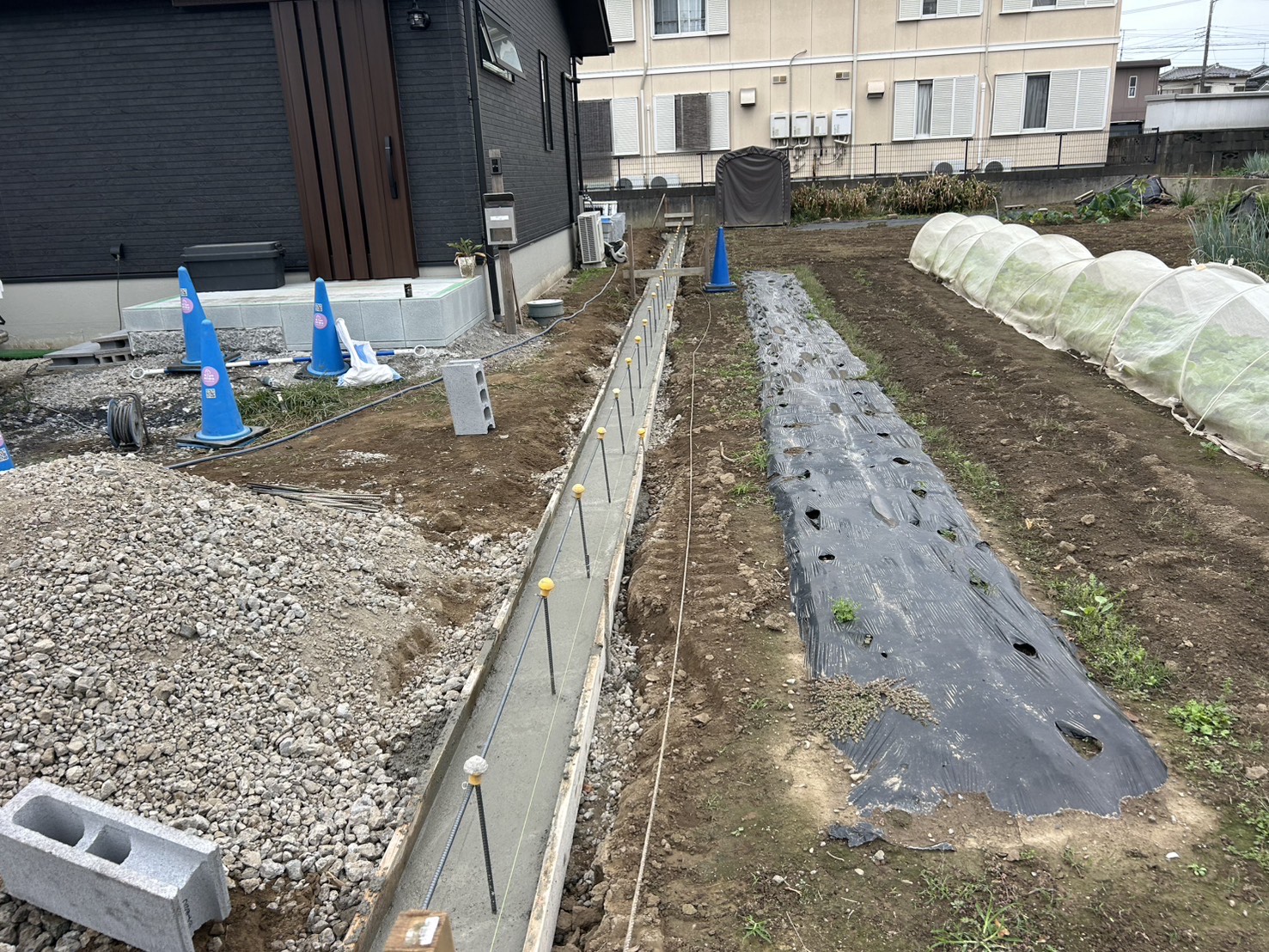 境界ブロックのベースコンクリート打設と、ブロック組積2段を施工しました。