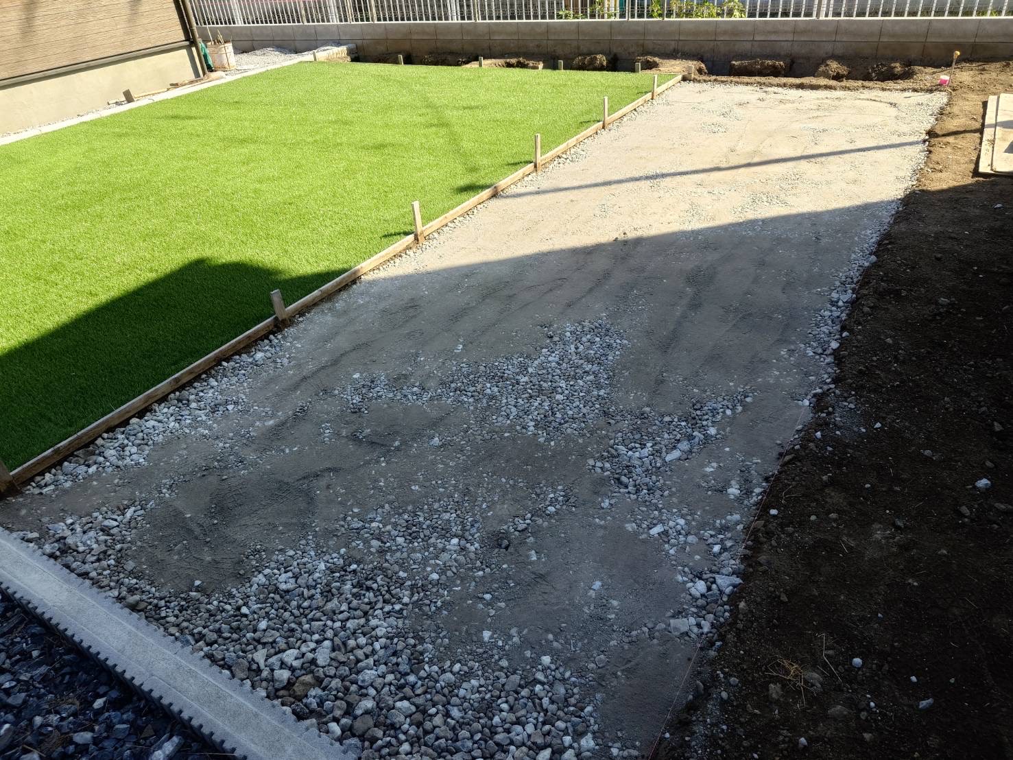 駐車場の土間コンクリートとお庭の砂利と人工芝は工務店さんが施工してくれてました。