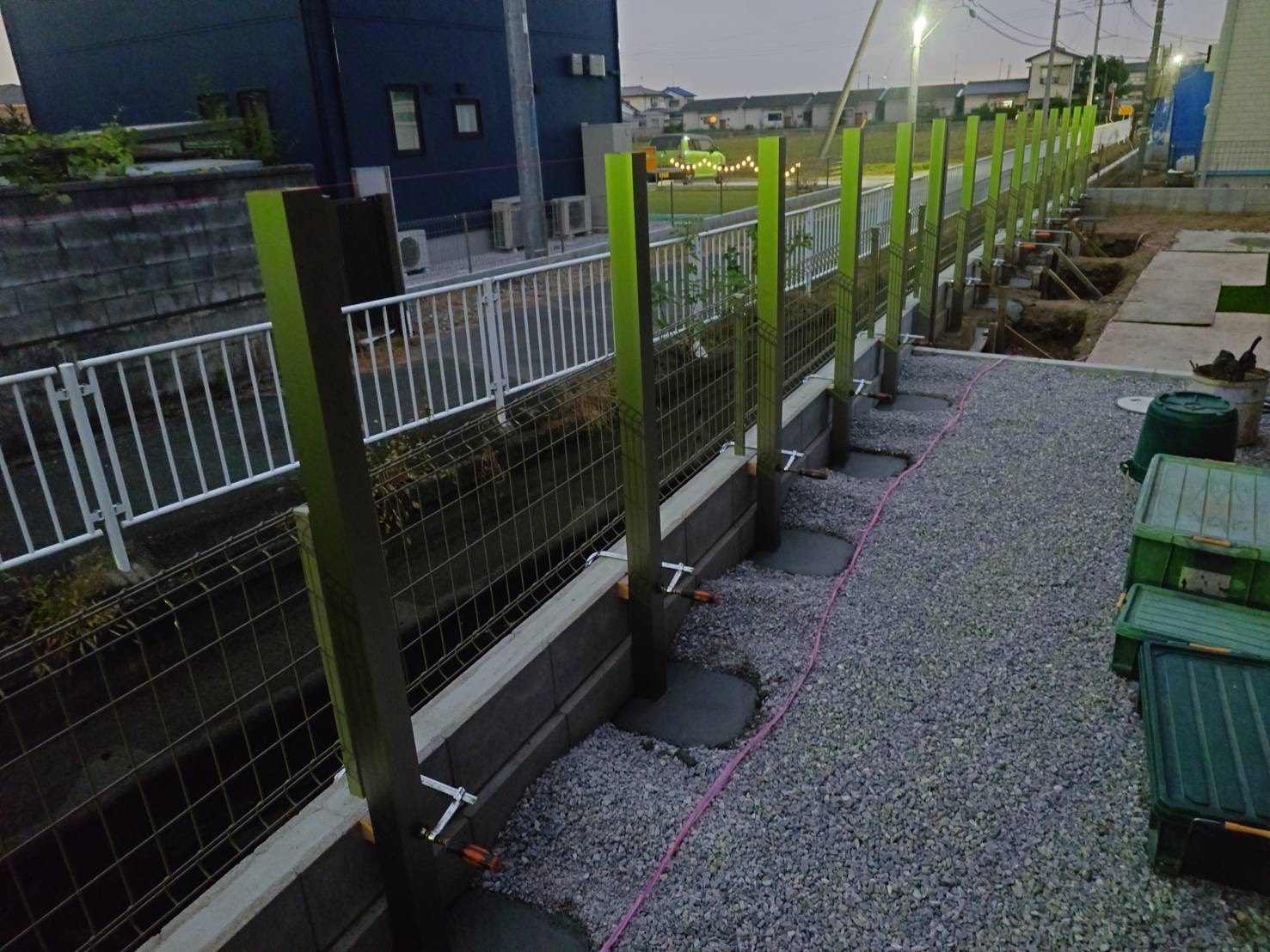 東側の隣地が水路で高低差が大きいので、お子様の転落防止兼目隠しフェンスを設置しております。